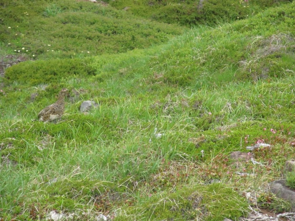 再び私たちと合流して、二ノ池から賽の河原へ。ハイマツの茂みに目を向けると、雷鳥がヒヨコぐらいの大きさの子供を何羽か連れていました。